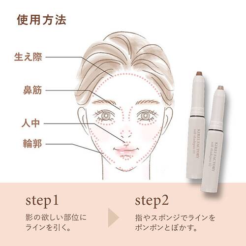 5mm程繰り出し、フェイスライン・あご下・おでこ・もみあげなどの陰影をつけたい部分にラインを引き、指やスポンジでお肌に馴染ませます。